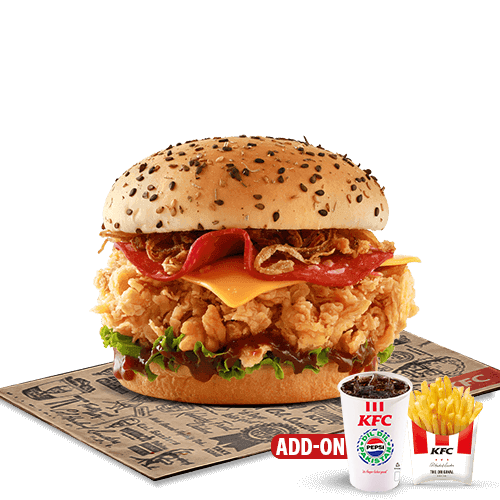 OG Zinger fillet layered with beef pepperoni, crispy fried onions, cheese and smokey BBQ sauce- sandwiched between an herb and black sesame bun
