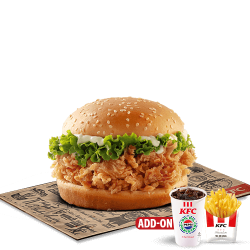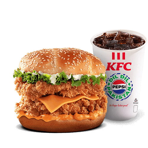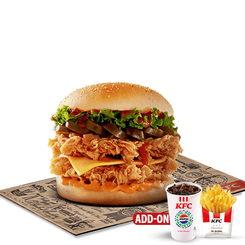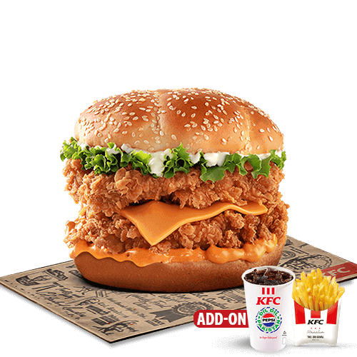 Our signature Zinger but Bigger! Double Zinger fillet with a combination of spicy and plain mayo, lettuce and cheese- sandwiched between a sesame seed bun