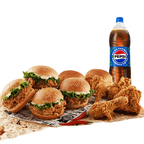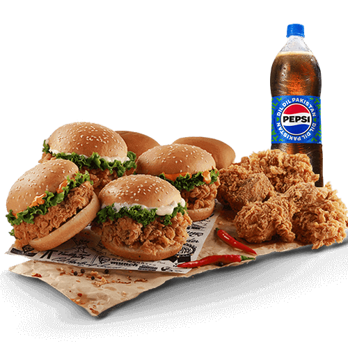 An ultimate meal for the fam. It includes 4 Zinger burgers + 4 pieces Hot and Crispy Chicken + 2 Dinner rolls + 1.5 Liter drink